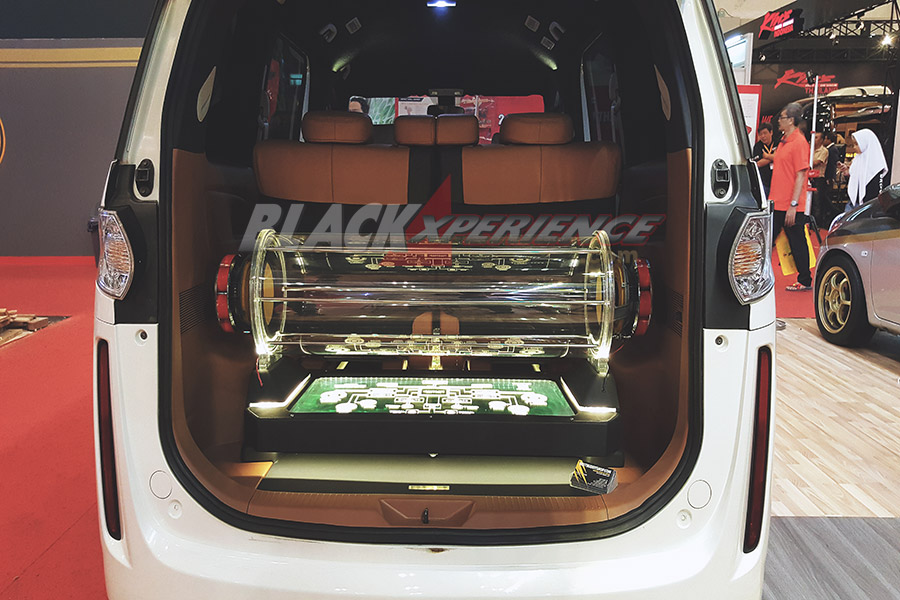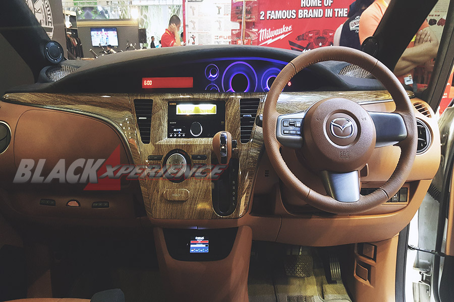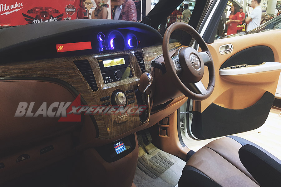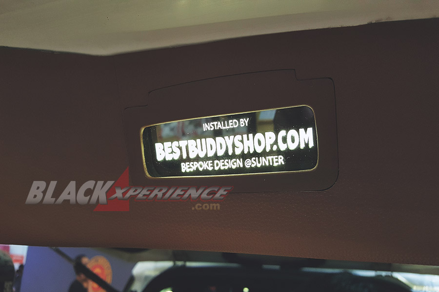Kepiawaian Afung tidak sebatas mengombinasikan perangkat audio premium untuk menghasilkan suara terbaik. Penataan sistem audio dengan pemilihan nuansa interior menjadi poin kuat dalam modifikasi ini. Pada ruang baris pertama, penggunaan aksen kayu dengan pemilihan warna cokelat memberikan kesan elegan dan mewah.