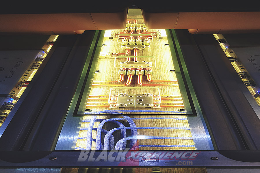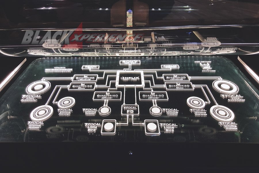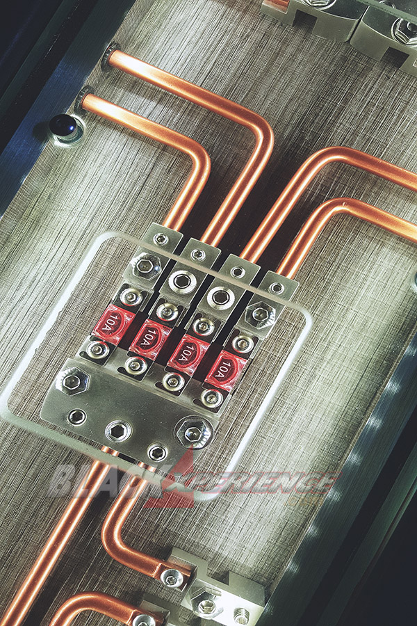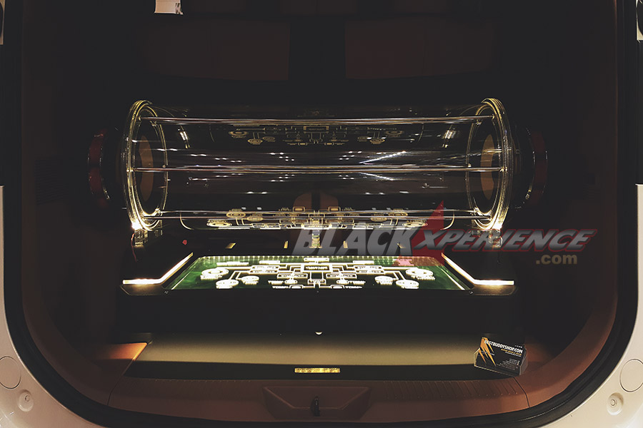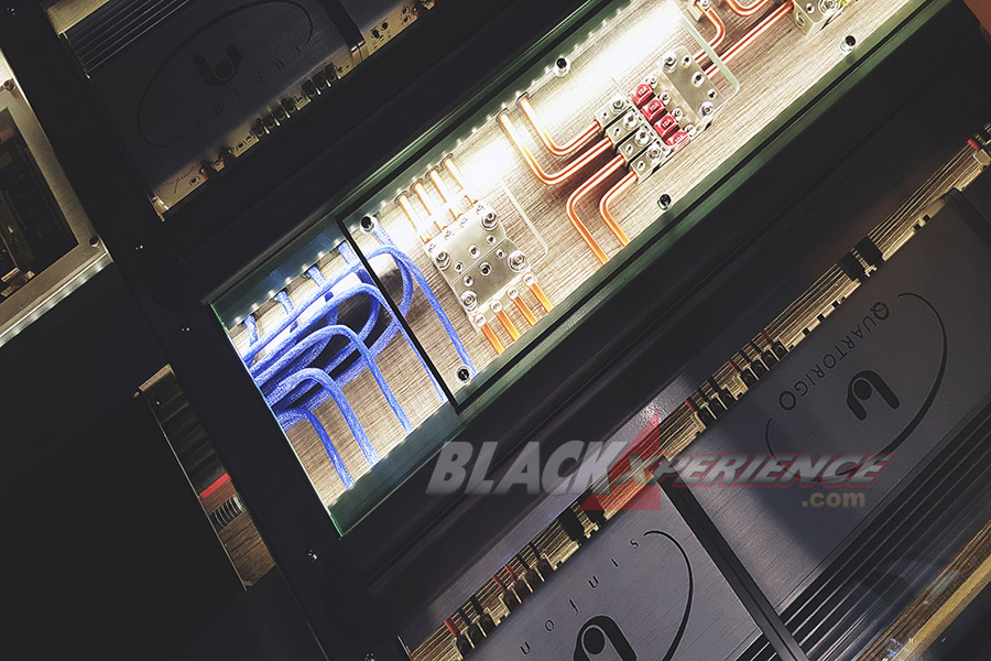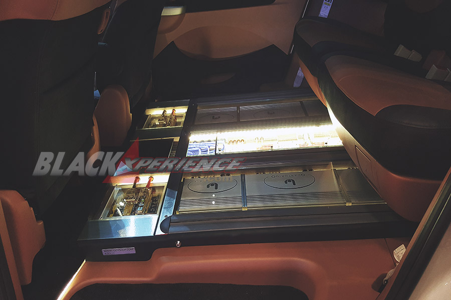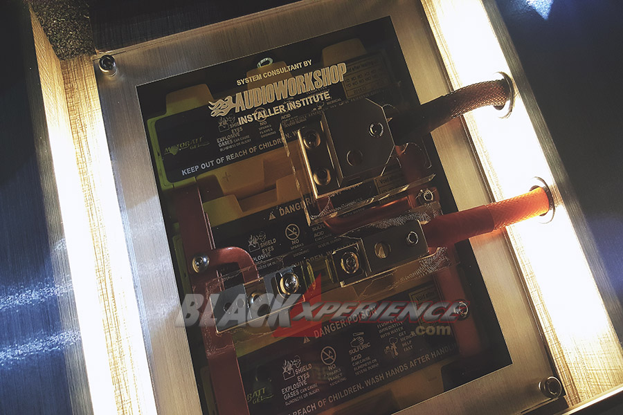 Pada baris kedua nuansa cokelat terus berlanjut, perangkat audio diletakkan pada lantai dengan acrylic. Di sini, Anda dapat menikmati visualisasinya. Bahkan jalur kabel dengan fuse ditata sedemikan rupa agar menjadi karya seni. Pada bagian belakang, kotak subwoofer dibuat dari bahan acrylic sehingga menambah estetika. Anda uga dapat melihat skema instalasi yang terletak di bawahnya. [aag/timBX]