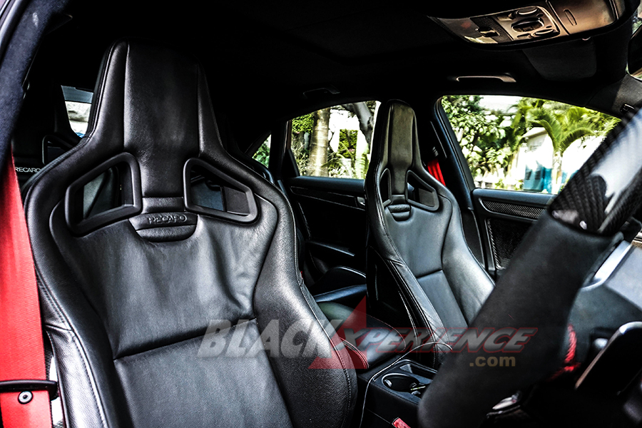 Sektor interior tak kalah dengan sektor lainnya. Alih-alih tenaga mesin yang besar, dashboard dan instrument cluster mengadopsi RS5, display monitor, panel dashboard yang sudah difinishing carbon. “Dengan model 4 pintu, keempat tempat duduknya menggunakan RECARO Sportster CS special Edition 2012 dibagian depan, sedangkan untuk bagian belakang RECARO Sportster CS 2017. Pada bagian setir menggunakan R8GT, termasuk paddle shift bawaan R8GT. Secara look telah di finishing carbon. Bagian atas terlihat sebuah sunroof webasto Holandia 730.”