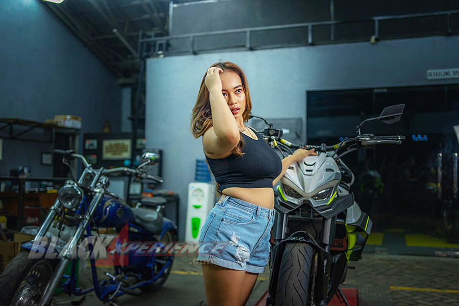 Photoshoot dan model menjadi satu aktivitas yang menarik bagi Zakia. Angel cantik, berkulit kuning langsat ini kali pertama melangsungkan sesi foto dan video dengan latar properti motor-motor kustom.