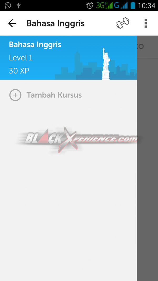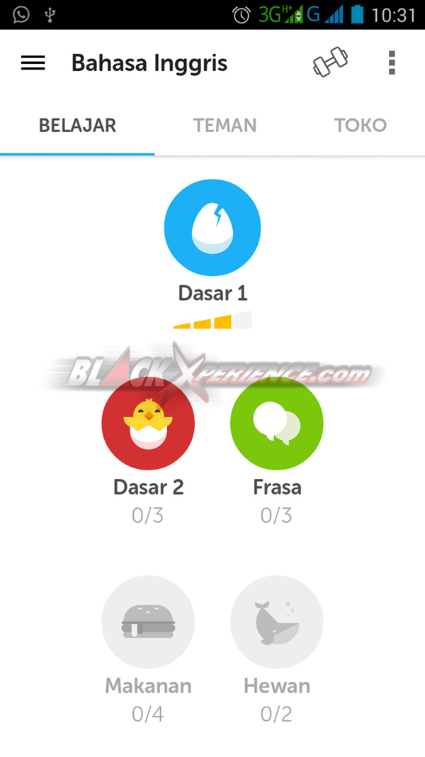 Di pojok kiri atas ada menu untuk menambah jumlah bahasa asing yang ingin dipelajari pengguna. Lalu menu utamanya ada modul pembelajaran yang bisa diakses langsung. Setiap modul berisi sedikitnya 3 latihan belajar bahasa asing.