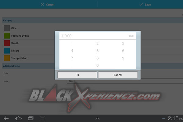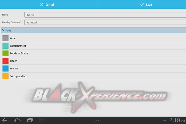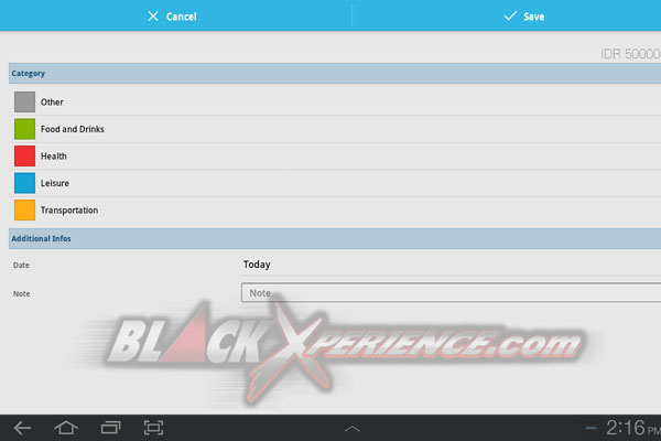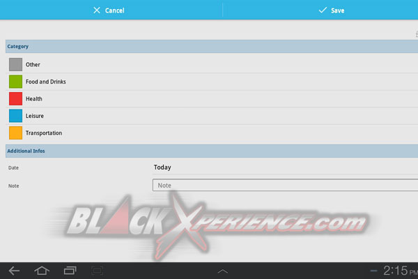 Pengguna juga bisa memilih beragam kategori yang disediakan sebagai tempat pengeluaran uang seperti biaya kesehata, biaya transportasi dan juga kebutuhan rumah tangga. Jika Expense Manager tidak menyediakan kategori yang biasa menjadi kategori pengeluaran Anda setiap bulannya, Anda diberikan kesempatan untuk menambah sendiri kategori-kategori lainnya tanpa batas. Pengguna juga bisa menempatkan limit terakhir pendapatan di setiap bulannya.
