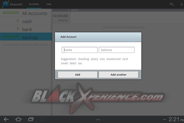 Aplikasi kedua adalah Finance41. Aplikasi pengelola keuangan yang kurang lebih sama dengan Expense Manager. Perbedaan terletak pada tampilan desain yang biasa saja dan kurang menarik. Tapi bicara fiturnya, aplikasi ini pun tidak kalah menarik. Setelah mengunduhnya dari Google Play, Anda harus mendaftar terlebih dahulu untuk menggunakannya. Pendaftaran aplikasi ini mungkin semata-mata untuk masalah keamanan, ketika aplikasi dalam gadget ini tersimpan terkena sebuah masalah.