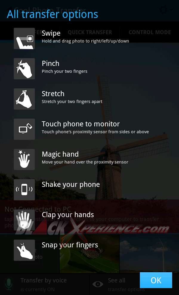 Dengan swipe, pinch dan stretch Anda bisa mentransfer gambar melalui sentuhan pada layar, entah itu sapuan jari ke kanan. kiri, atas, bawah, atau mencubit atau melebarkan jari. Sedangkan touch phone to monitor, magic hand, dan shake your phone transfer dilakukan dengan cara menyentuhkan perangkat Anda ke monitor, menyapu tangan di atas proximity sensor, dan menggoyangkan perangkat Android Anda. Dengan metode clap your hand, snap your fingers, dan whistle, transfer dapat dipicu oleh tepuk tangan, menjentikkan jari, dan siulan. canggih bukan?