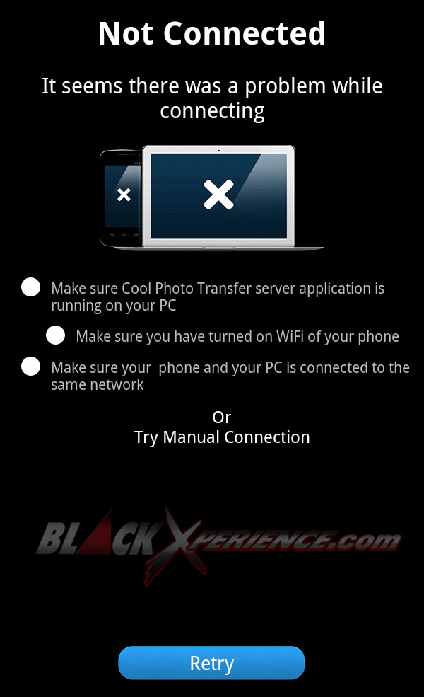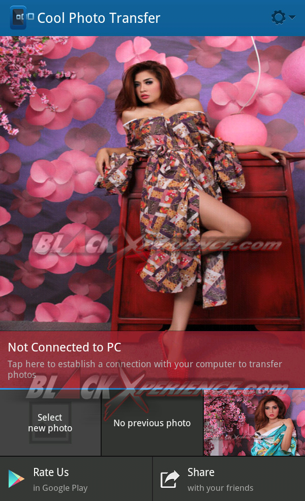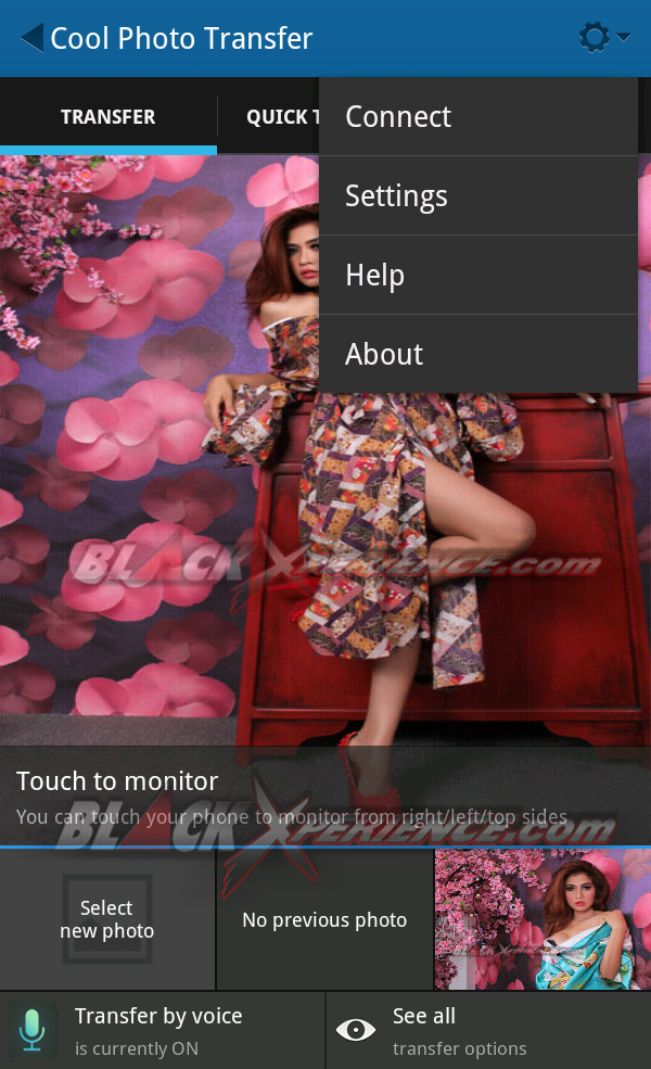 Aktifkan koneksi pada perangkat Android Anda dengan menekan tombol gir yang terletak di panel bagian atas aplikasi, lalu tekan Connect. Di sini Anda dapat memilih apakah Anda ingin connect secara otomatis atau manual. Untuk memeriksa apakah perangkat-perangkat ini sudah terhubung satu sama lain, Anda dapat melihatnya pada Connection Status pada aplikasi PC Cool Photo Transfer. Setelah perangkat terhubung Anda bisa mulai transfer.