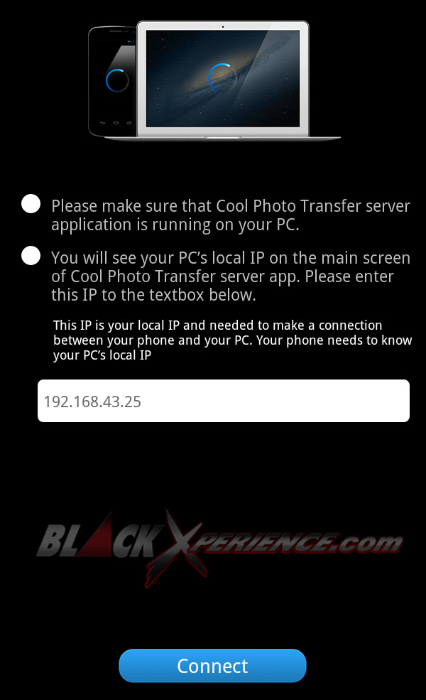 Untuk menggunakan aplikasi ini, pertama pengguna harus tersambung pada jaringan WiFi yang sama. Selanjutnya, unduh dan instal Cool Photo Transfer PC langsung dari situs resminya. Ada dua aplikasi yang harus diunduh yakni aplikasi server yang dapat Anda unduh langsung dari PC atau Laptop dan aplikasi mobile yang dapat Anda unduh langsung di Google Play Store. Setelah keduanya terinstal, jalankan aplikasi di masing-masing perangkat.
