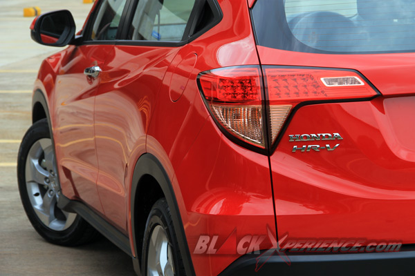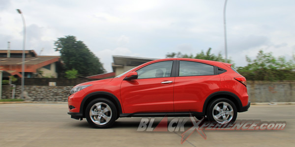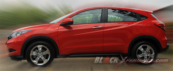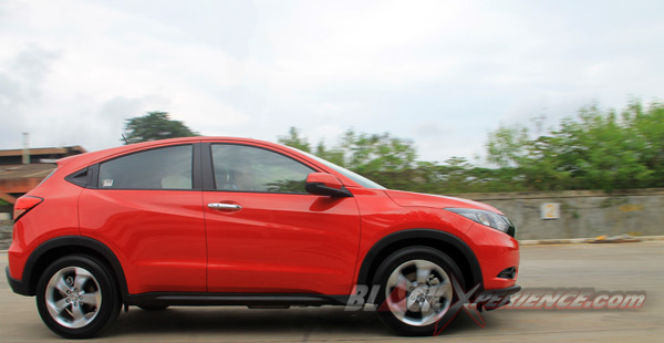 Tampak dari samping, HRV generasi kedua ini terlihat sebagai crossover dua pintu. Padahal ia merupakan model 4 door tulen. Kesan coupe ini muncul karena Honda menyelipkan handle pintu penumpang belakang di pilar C. Unik memang, tapi hal ini juga diterapkan pada Nissan Juke. Jadi bukan sesuatu yang sangat istimewa bagi kami meski ketika hal itu berpadu atap yang merendah di bagian belakang mampu menimbulkan dampak desain yang jauh lebih manis bila kita membandingkan dengan SUV Honda semisal CR-V.
