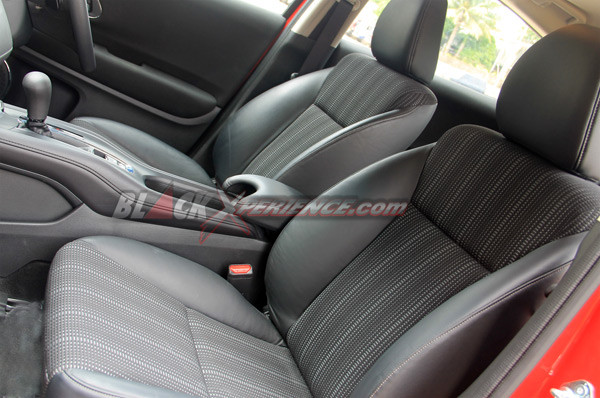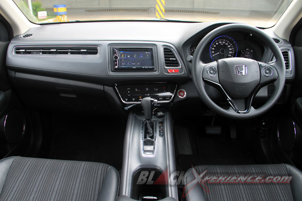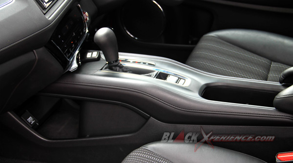 Masuk ke kabin, Honda menyajikan tata letak ruang kokpit yang cukup membuat kami melontarkan kata "Wow!" Pada HRV, Honda terlihat sedikit tidak biasa. Ruang pengemudi dan penumpang depan seakan dipisahkan oleh konsol tengah yang membentang dan menyatu dengan dashboard. Pada konsol ini terletak tuas transmisi CVT, Parking Brake, Brake Hold, serta cup holder.