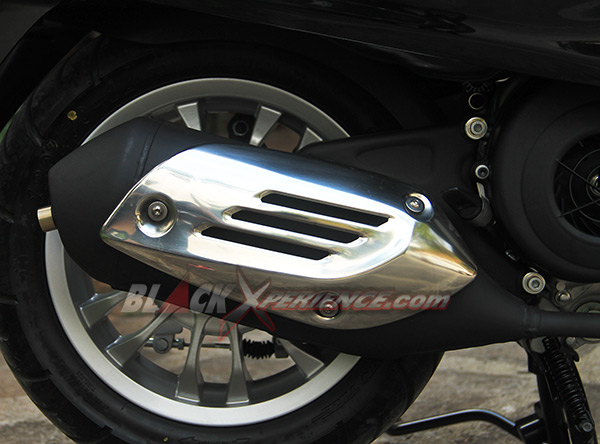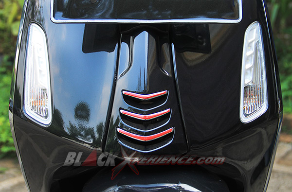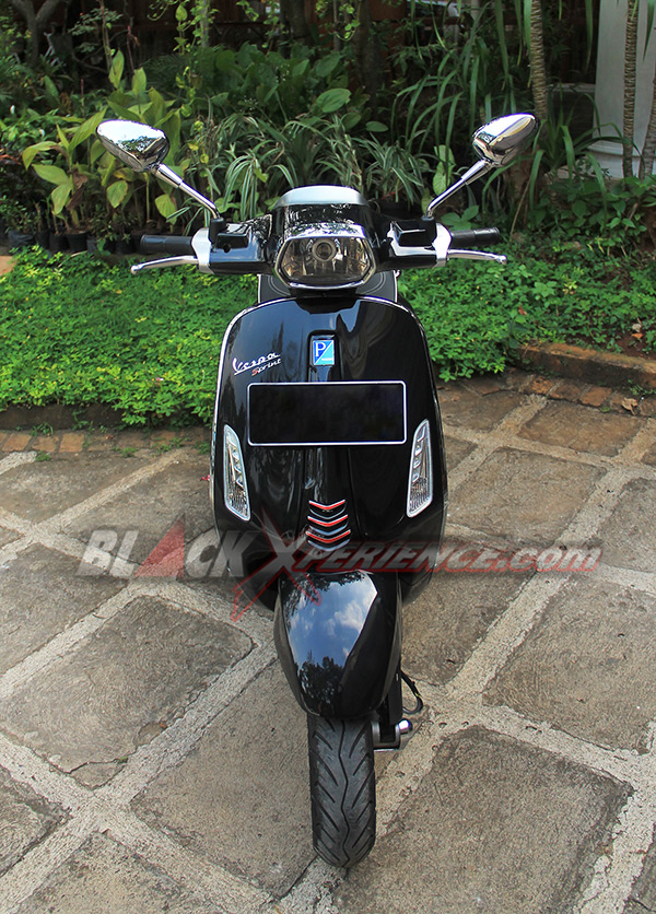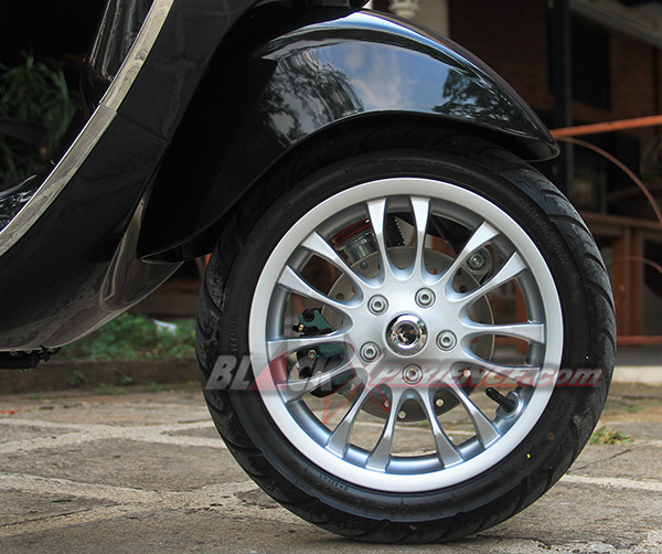 Disain velg yang mengandalkan multispoke serta diberi kelir silver, dibalut dengan karet berukuran 110/70. Dibalik front wing, produsen telah menyisipkan bagasi layaknya Vespa Sprint lawas yang memiliki bagasi serupa. Cara pengoperasian bagasi ini pun sangat mudah, dengan cara menekan anak kunci pada posisi engine off, lalu bagasi atau ruang penyimpanan ini akan terbuka secara otomatis. Kapasitas yang dihadirkan memang tidak begitu besar, namun ruang tersebut cukup untuk menampung dua buah botol minuman ketika sedang berkendara.