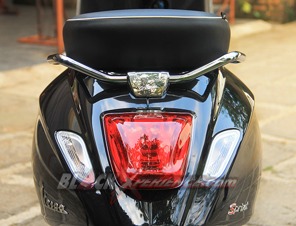 Beralih pada bagian bodi samping, layaknya kumbang yang sedang menutup sayapnya, Vespa Sprint ini tampil sedikit lebih bongsor. Namun hadirnya behel disektor buritan, mampu mengesampingkan kesan besar tersebut. Untuk memberikan identitas resmi, bada bodi samping bagian kanan telah disematkan dengan badge Sprint dan bagian kanan badge khas Vespa. Taillight yang berada diporos, disandingkan dengan dua buah lampu sein sebagai indikator keselataman. Uniknya adalah ketika lampu rem tersebut bekerja, maka shape 'V' akan terlihat dengan jelas, sama seperti yang ada pada model Primavera.