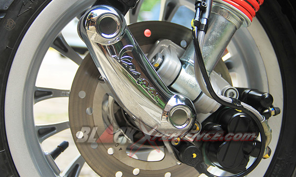 Suspensi depan : Monoshock absorber, coil spring, panjang mounting kaliper 78 mm