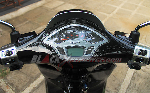 Speedometer, ini memadukan dua unsur sekaligus. Digital pada panel instrumen fuel capacity, dan jarum speedometer yang masih menggunakan model konvenional. Dalam panel instrumen tersebut, kita dapat mengatur beberapa mode, pertama adalah trip A, Trip B, serta mode keseluruhan kilometer. Disamping itu, beberapa lampu indikator seperti fuel capacity, watch, oil meter, high beam, lampu sein, serta fitur ABS terdapat pada panel digital tersebut. Lengkap! Sedangkan saklar yang berada pada bagian kanan dan kiri memiliki peranan yang berbeda. Bagian kanan terdapat pengaturan lampu, mode, serta starter. Sedangkan dibagian kiri, telah dipersenjatai dengan lampu indicator sein, pengaturan lampu jauh atau dekat, serta klakson.