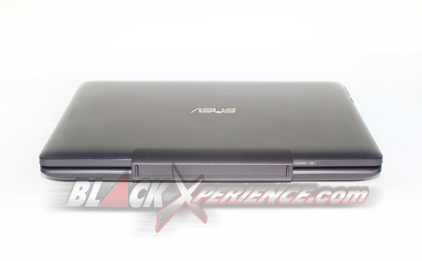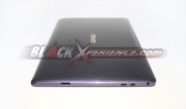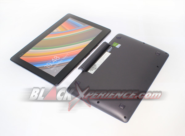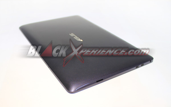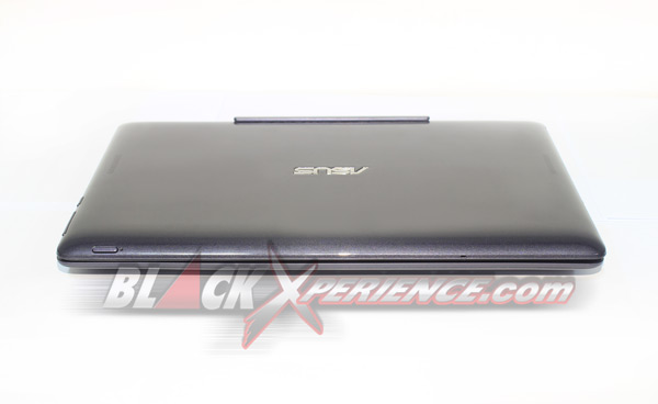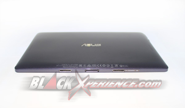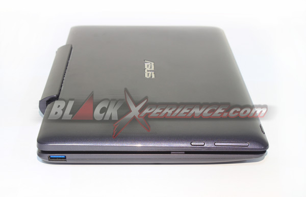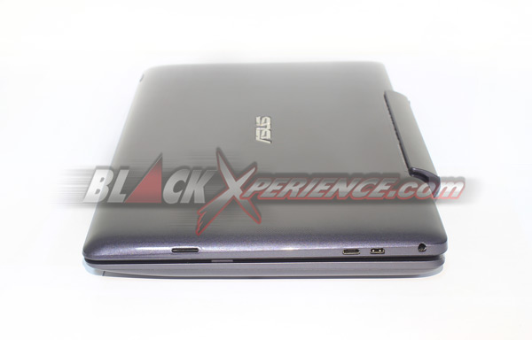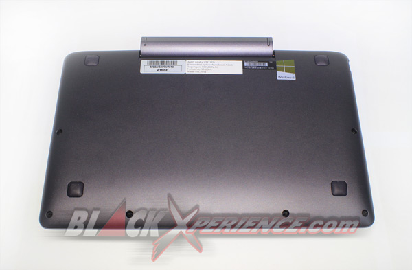 Di bagian bawah terdapat 3 penghubung dudukan, dua di kiri dan kanan sebagai engsel dan ditengah sebagai port data. Pengeras suara stereo hadir di bagian belakang T100, sangat cocok untuk menikmati audio film, lagu, maupun main game. Secara ukuran dan bobot, tablet hybrid ini terbilang cukup nyaman saat digunakan. Bobot tablet ini hanya 550 gram dengan lebar 10,5mm saja. Secara ukuran ketebalan, T100 memang terbilang cukup tebal, namun dengan tepian yang berbentuk tumpul membuatnya tampak lebih langsing.