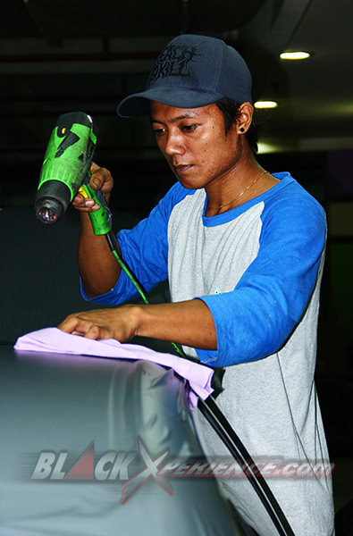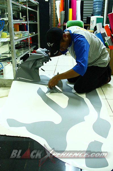 Detailing loreng ala US Army pun segera ditempel pada bodi mobil. Tidak semua langsung ditempel ke bodi, melainkan satu-persatu pola disusun sesuai dengan gambar desain yang telah disiapkan. Inilah proses puncak dari modifikasi atau penggarapam wrapping cutting sticker. Detailing motif atau tema sebuah modifikasi cutting sticker menuntut ketelitian ekstra, terlebih bila tema yang diambil mengangkat motif ataupun desain yang rumit. "Tingkat kesulitan bertambah ketika customer menginginkan motif atau desain yang rumit seperti tokoh kartun, mimik wajah, semuanya harus didesain dan di-cutting per item gambarnya", beber Imam.