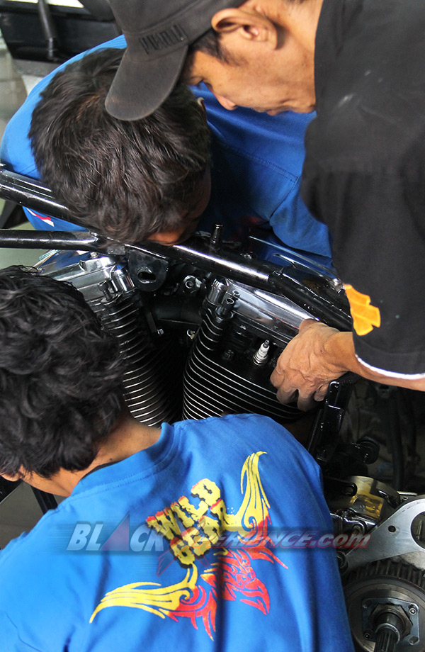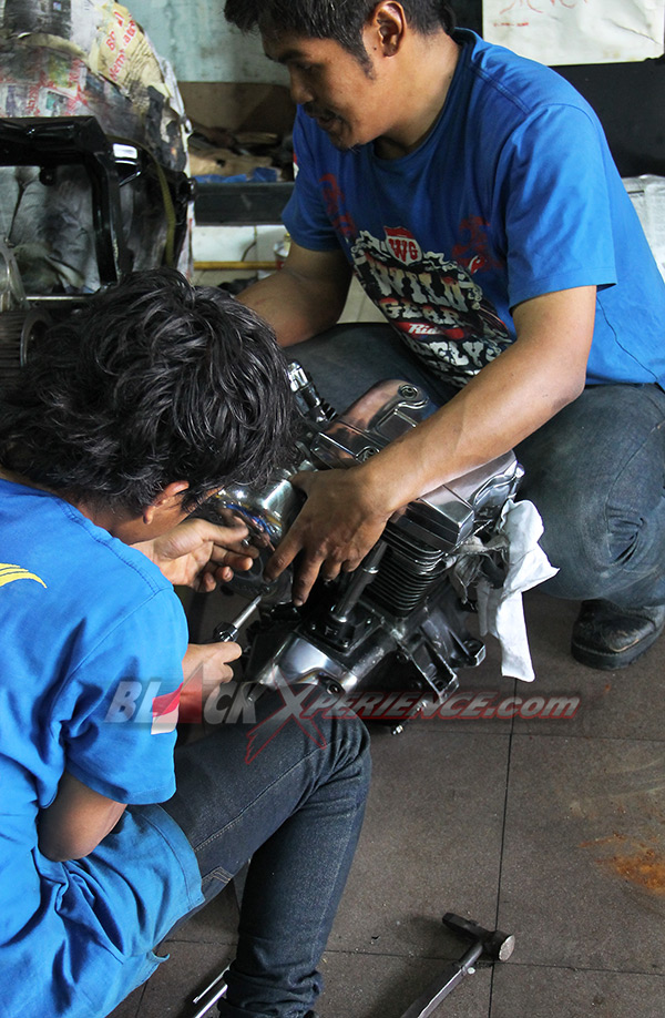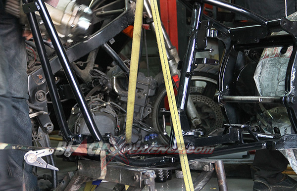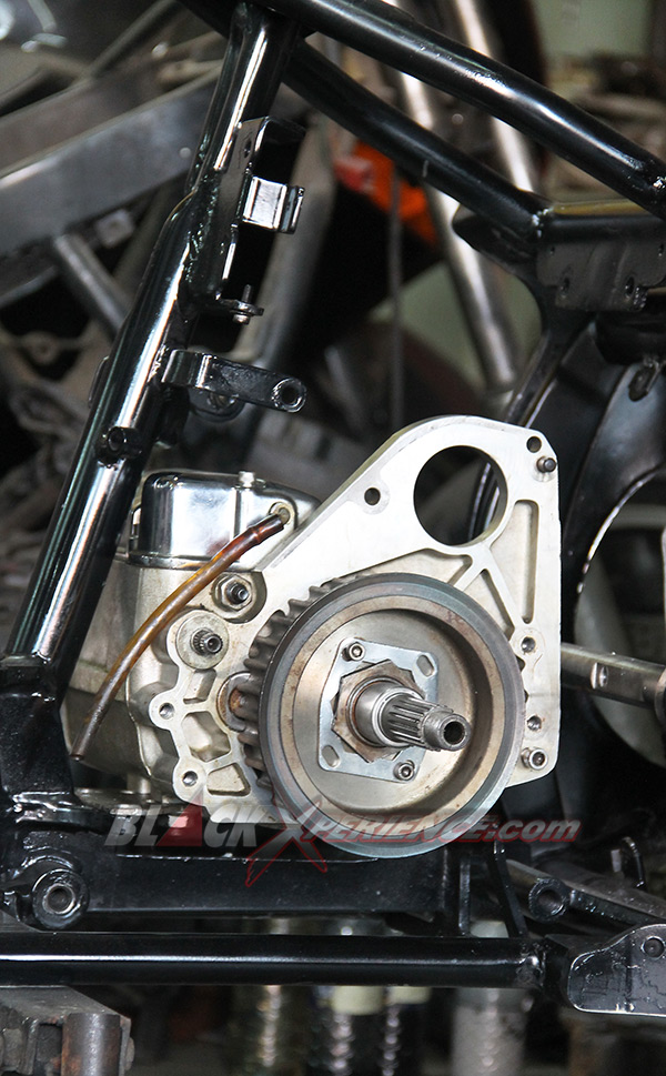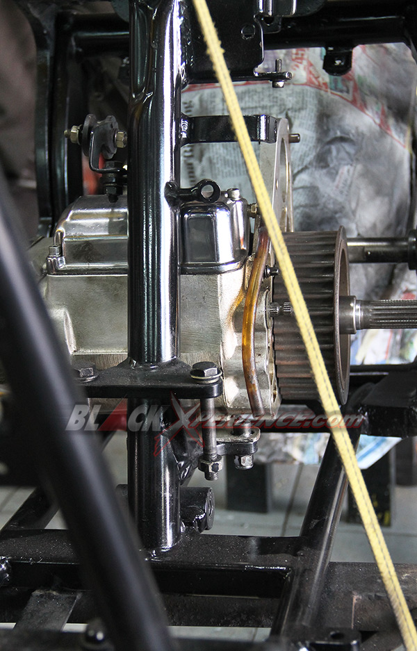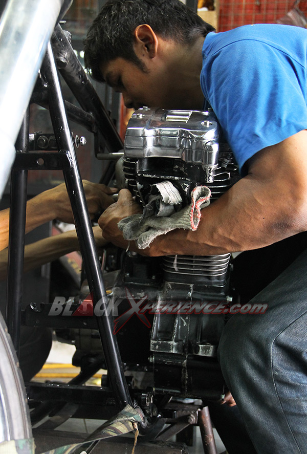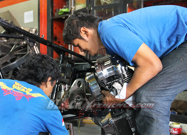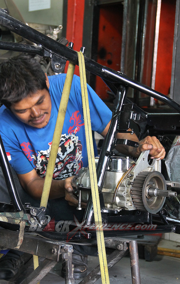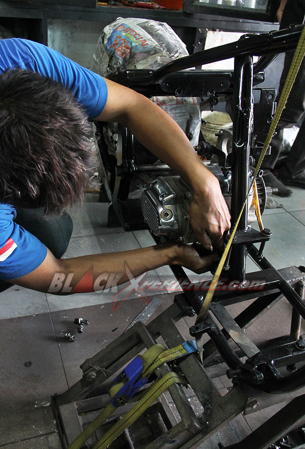 Pekerjaan berikutnya yang membutuhkan perhatian ekstra yakni perakitan mesin. Mesin berkapasitas 1800 cc tersebut telah selesai dirakit dan siap untuk dicoba ke rangka. Ini diperlukan untuk memastikan dudukan atau bracket serta engine mounting agar sesuai aliasi presisi. Fitting mesin ini sekaligus menjadi proses perakitan mesin ke rangka pada tahap awal. Tak lupa girboks pun juga di ujicoba ke rangka sang EVO.