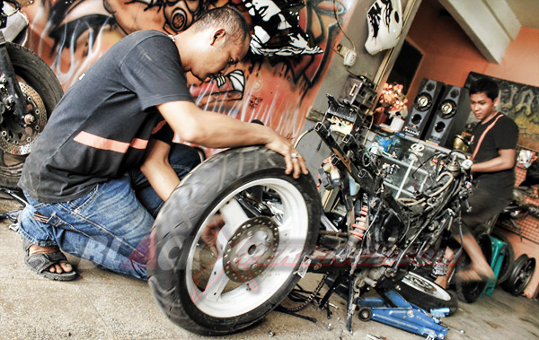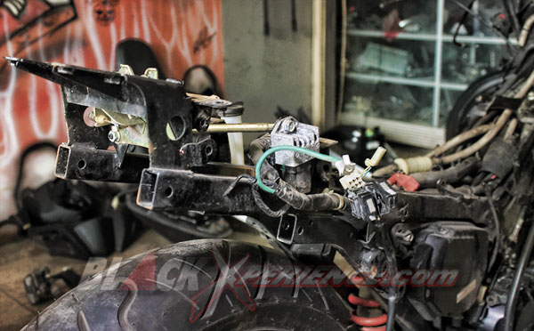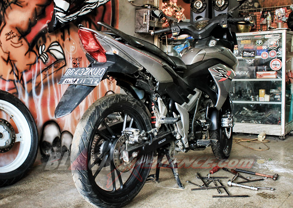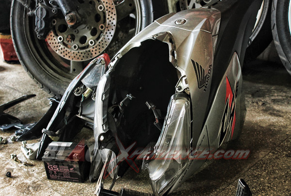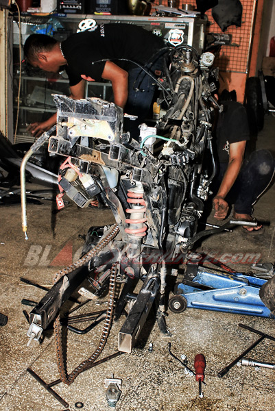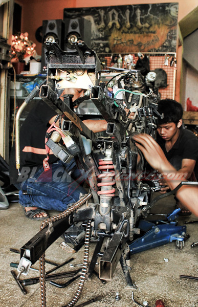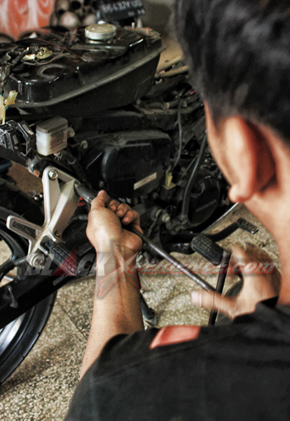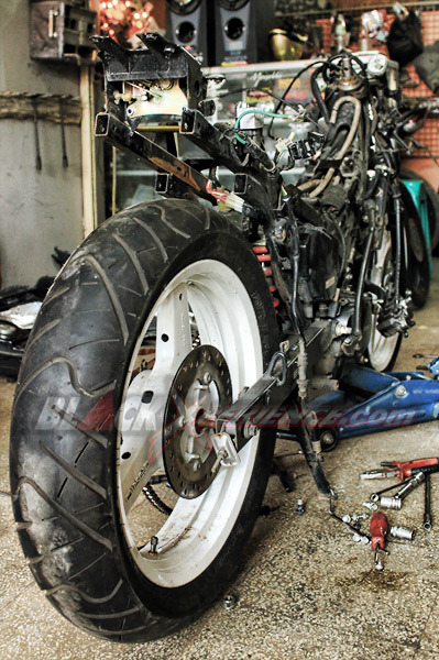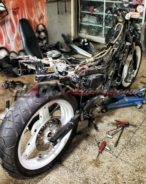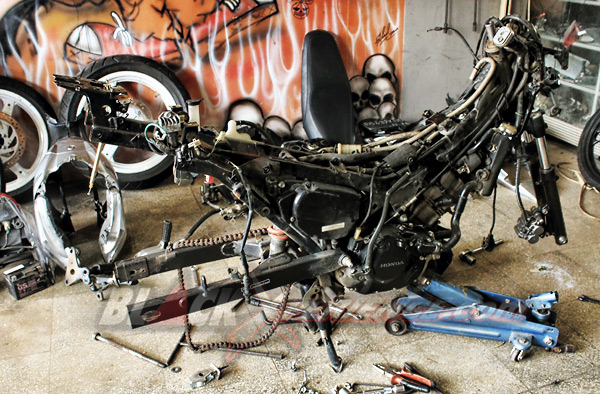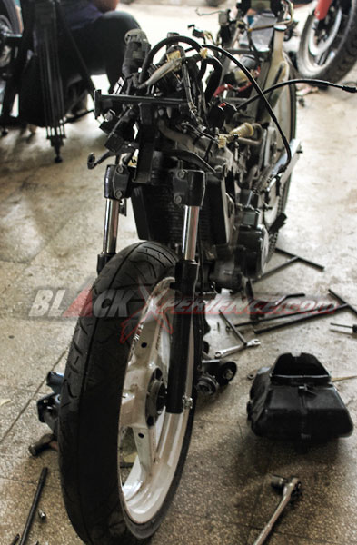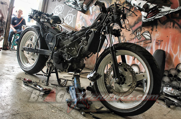 Sejumlah persiapan pun dilakukan, mulai dari mencari gambar CBR400 yang diinginkan hingga menggarap sejumlah desain yang nantinya dipakai untuk pedoman penggarapan body modifnya. Pembongkaran adalah target awal Uj yang menjadi leader dalam project ini. Seluruh body berhasil dilepas, hingga sektor kaki-kaki, yakni roda. Satu set velg baru pun langsung dipasang.