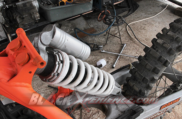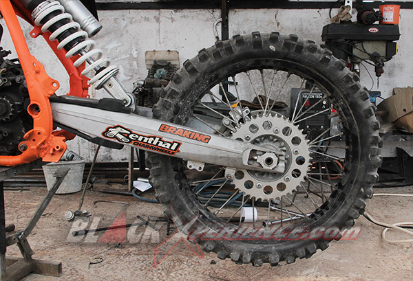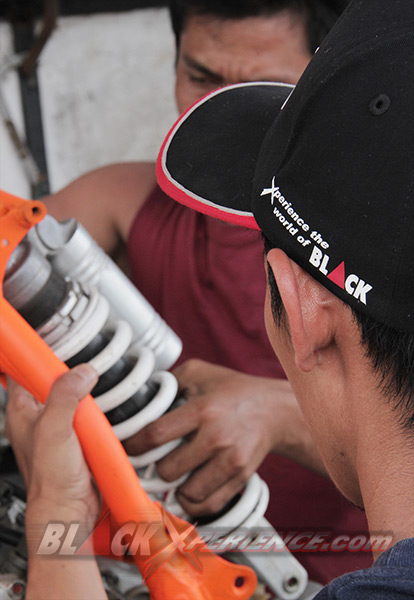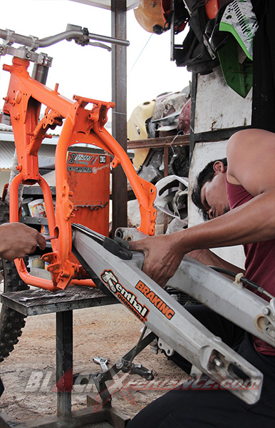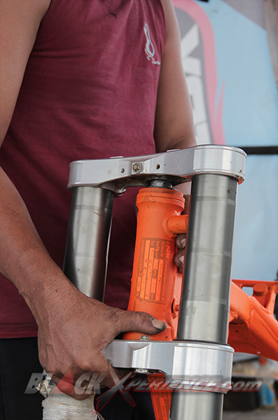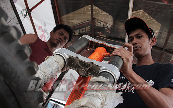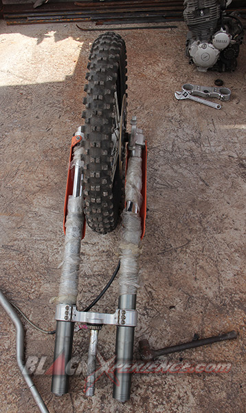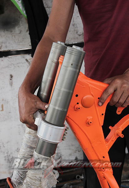 MenunggubaranglainnyakomplitparamekanikCaos Custom Bike mulaimemasangsuspensibagiandepankemudiandiikutidenganpemasanganrodadepansekaligus. Setelahitususpensisiapdipasangpadadudukansegitiga sang Yamaha Scorpio supermoto. Selanjutnyayaknipemasangan swing arm. Shockbreakerbelakangmerupakanbagianakhir yang harusdipasangke motor.