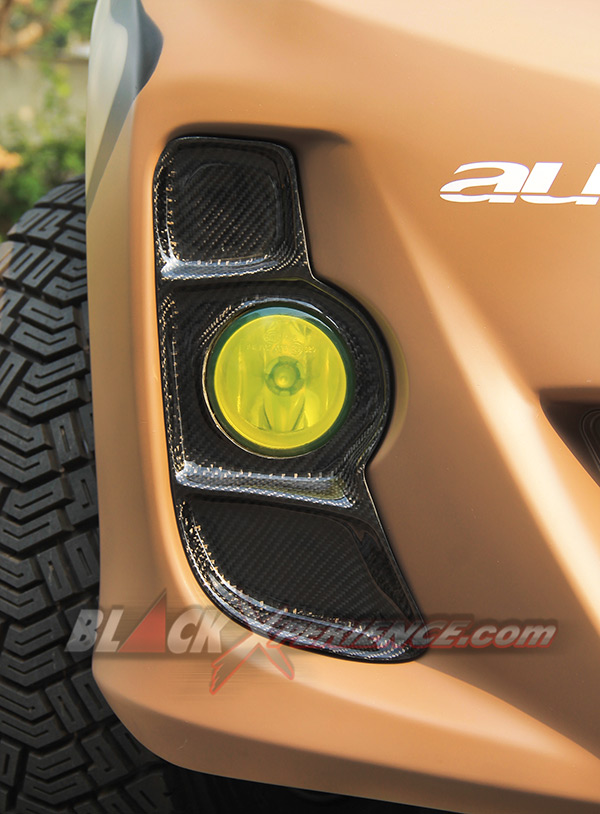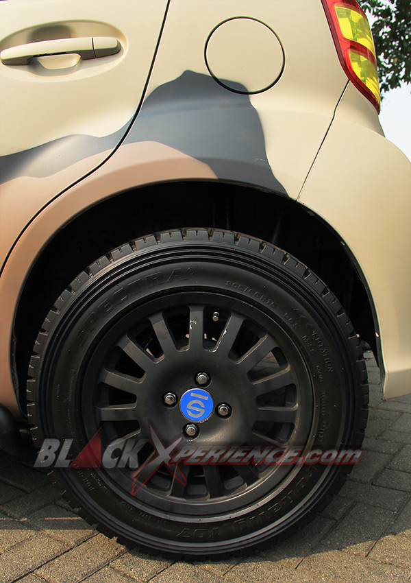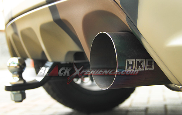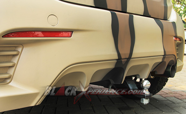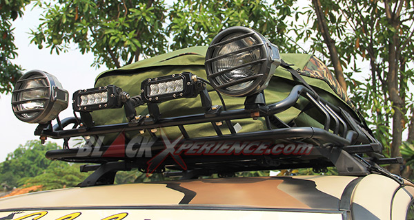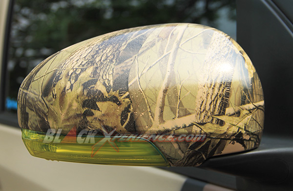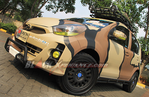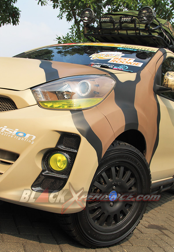 Eksterior : Custom Plastic Mivy Front +Rear Body Kit, ustom Front Foglamp Cover Carbonized Finished, custom Bolt-on Front Bumper Protector, custom Bolt-on, side Bumper Protector, custom Bolt-on Rear Towing Hook, sport Rack Bar+ Sport Camo Buzz Rack, Warn 5 inci Off Road Light with Apex-3R Autovision All Weather, Bulb 90w/100w, Autovision LED Bar 4 inci, custom Repaint Easy Skin Camo colored Head Lamp, custom Projector with DRL function+ Demon Eyes Inserted, Apex-3R, Autovision Bulb All Weather H11 Fog Lamp+ Low Beam, Tom’s Shark Fin Antenna, custom Hydrographic Art Camo side window frame ornament, custom HKS Rear Muffler, custom Full Easy Skin Camo Colored Plastic Rubber Paint with Free Hand Camo Graphics Finished