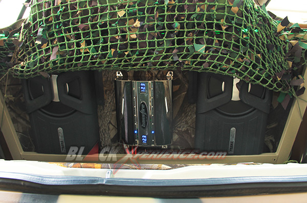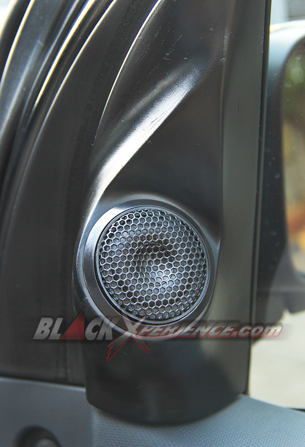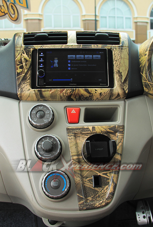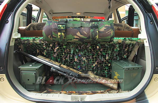 Senapan angin, aksesoris berwujud bom granat menjadi pelengkap yang mengarah pada konsep jiwa petualang. Ide kreativ lain yang dituangkan pria pemilik Optima Auto di kawasan ITC Permata Hijau ini berupa boks audio yang mengedepankan tema sebuah kotak harta karun dipenuhi rerumputan di bagasinya. Di dalam boks tersebut terdapat sepasang aktiv subwoofer bass tube dan 2 unit Trans audio 8 inci. Sementara head unit-nya mengandalkan Clasrion AX-1 dengan sistem operasinya berbasis Android, sementara tweeter diletakkan di pilar A. Sistem 2-way menjadi penguat sound di kabinnya dengan komposisi 2 unit Trans Audio 6t,5 inci Component Pasive Speaker.