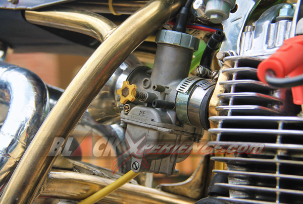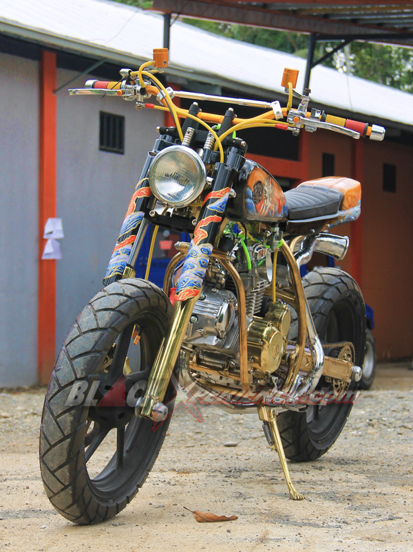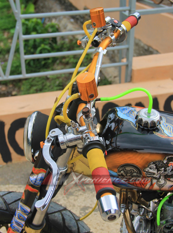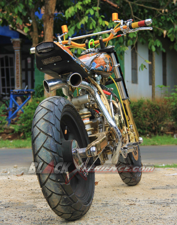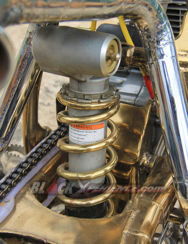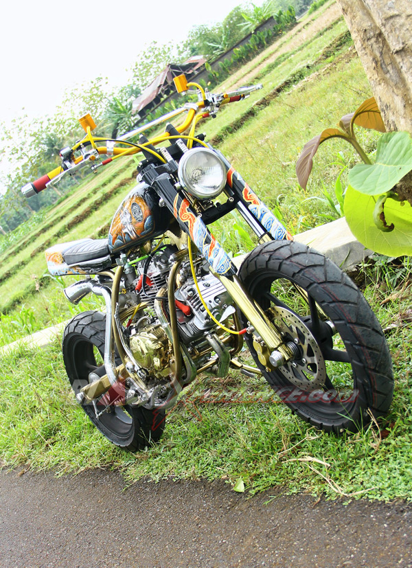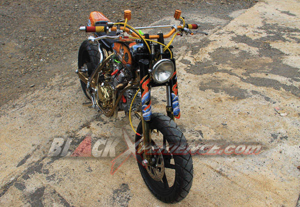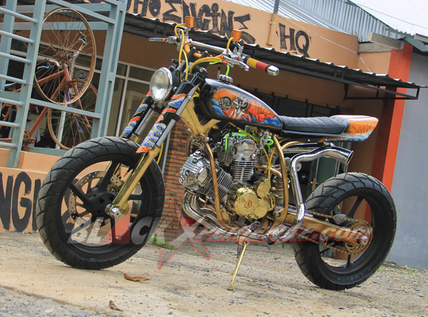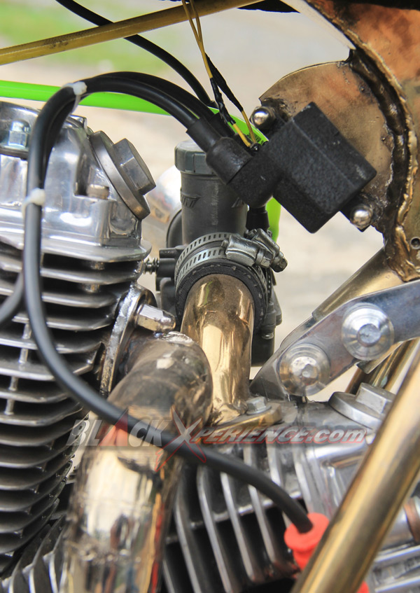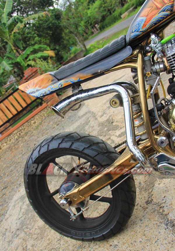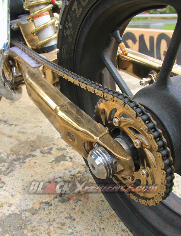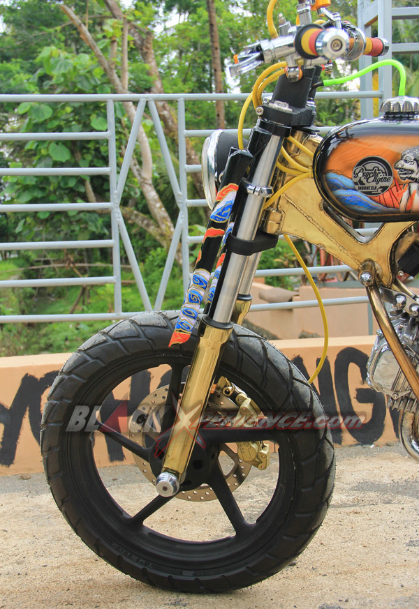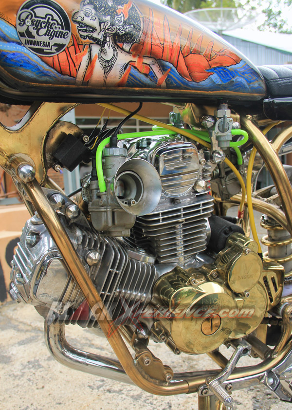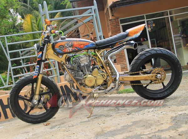 Proses pertama yang dibuat yakni sasis alias frame, komponen ini dibuat full buatan tangan Yusuf, dengan pengelasan listrik. Frame ini dibalut dengan warna emas menyeluruh dari sisi depan hingga belakang. Selanjutnya berbicara sektor mesin. Di bagian ini, sudah terlihat jelas proses custom yang dilewati. Mesin GL-Max tahun 1983 ini menjadi sangar dari sisi dapur pacu, tenaga naik menjadi 400 cc, dieksplor dari mesin berbasis V-Engine.