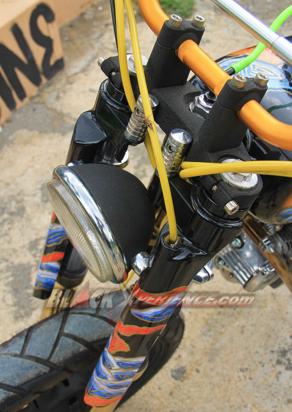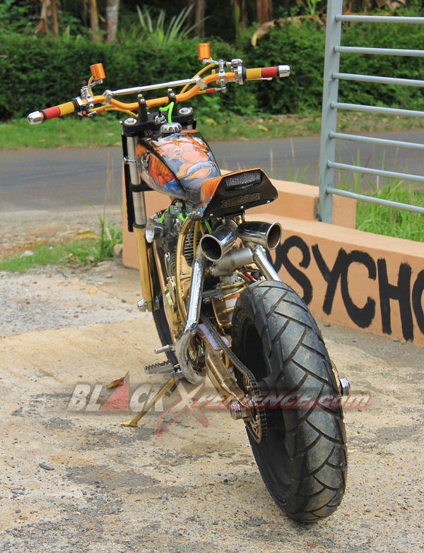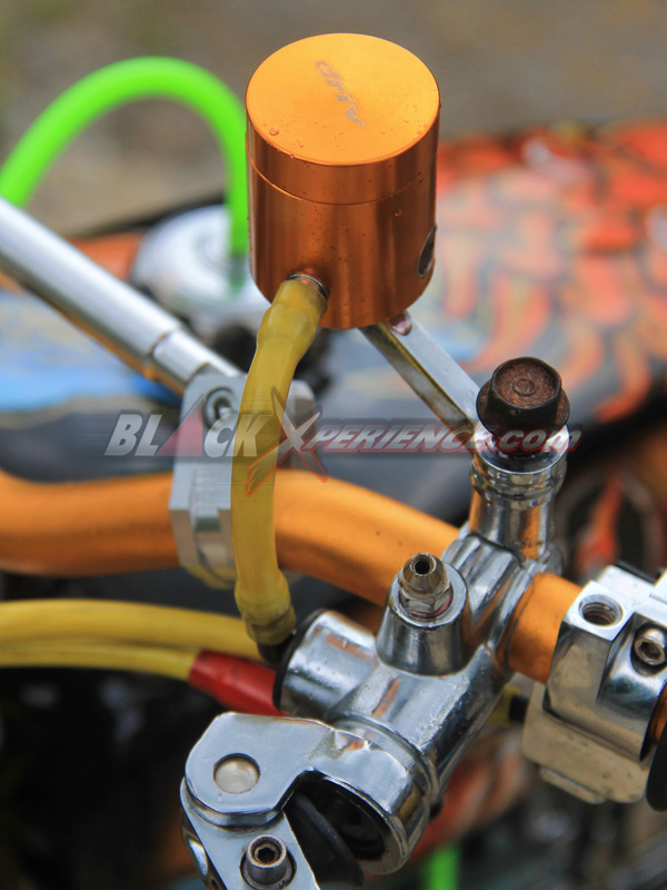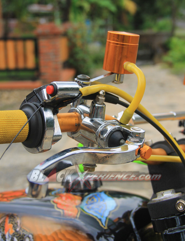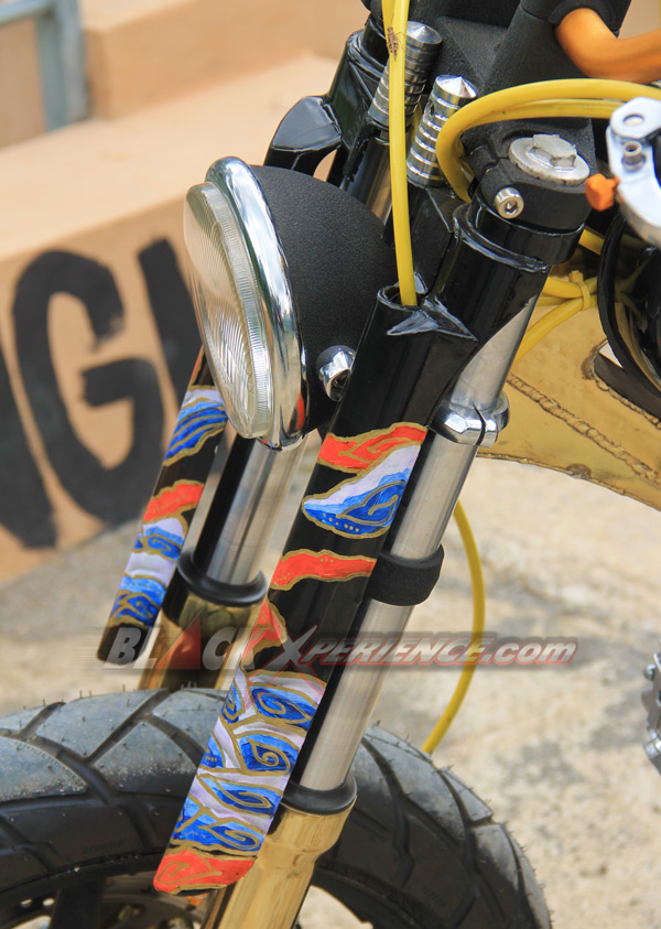Kaki-kaki menggunakan suspensi Yamaha Byson custom dan dilengkapi dengan monoshock Triumph produksi 2008. Suspensi depan juga dilengkapi dengan cover ala KTM. Menutup bagian akhir modifikasi ini ada sektor aksesoris berupa jok custom berlapis MBTech, lampu depan HD, dan lainnya. Kopling dibuat bersistem hidrolik ala Yusuf. Lampu-lampu pelengkap lainnya berupa sein dan stop lamp cukup menggunakan produk aftermarket. [nus/timBX]