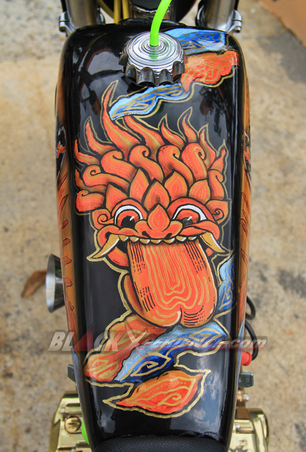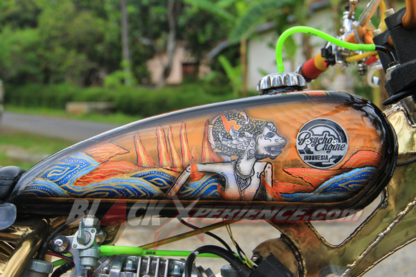 Bodi custom-nya dibuat dari plat galvanis yang dikerjakan oleh Endi Artwork. Grafis pada bodi mencerminkan kisah pembuatan motor ini, Anoman Obong. Bahan material pengecatan dari acrylic, gold ink, white ink, serta black chinese ink. Tim alias crew yang mengerjakan proyek final bodi dipasrahkan pada Adan Fajar Maruciel.