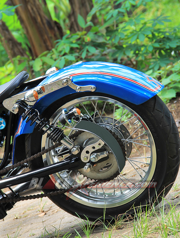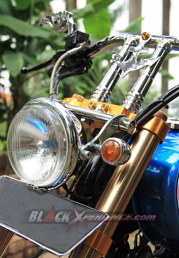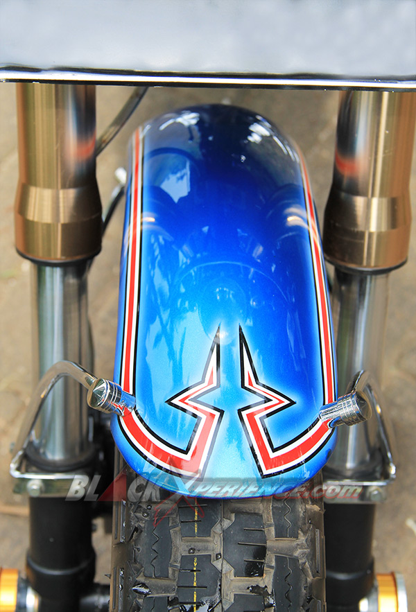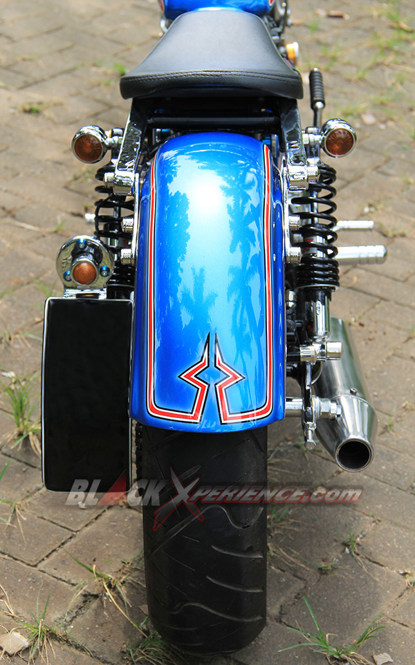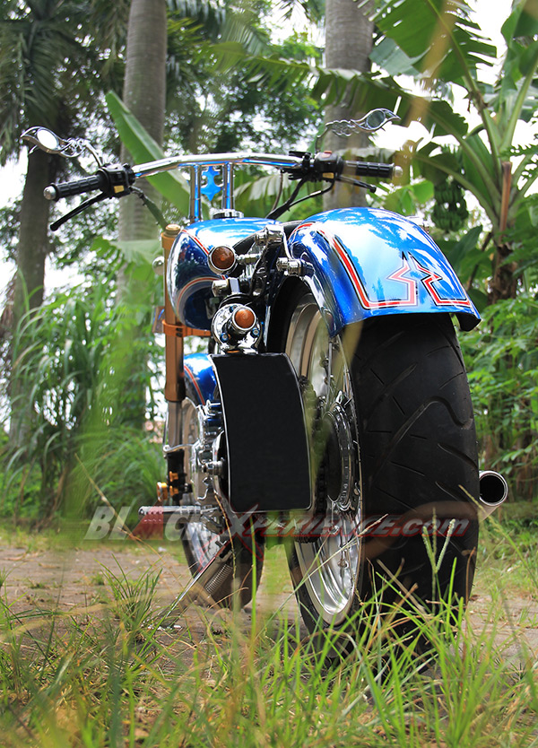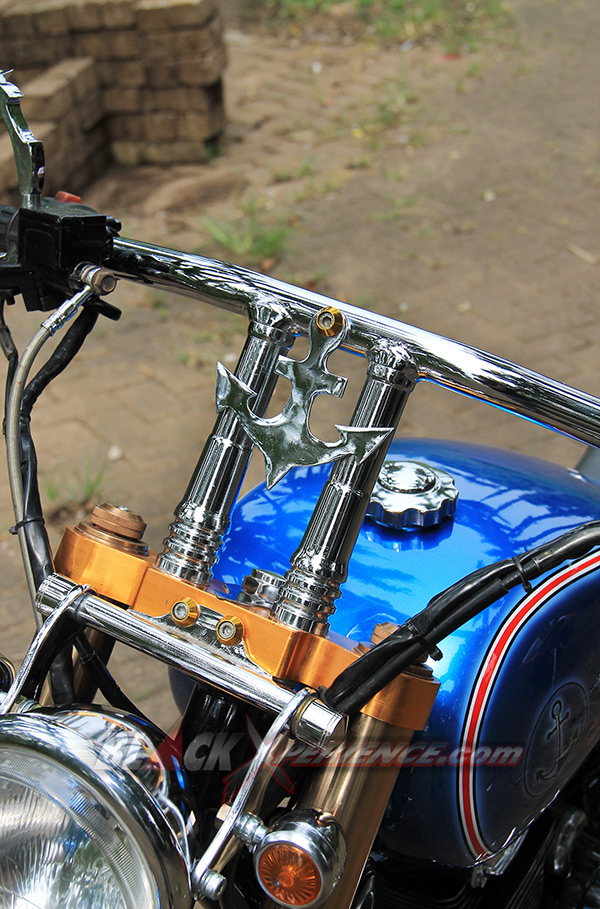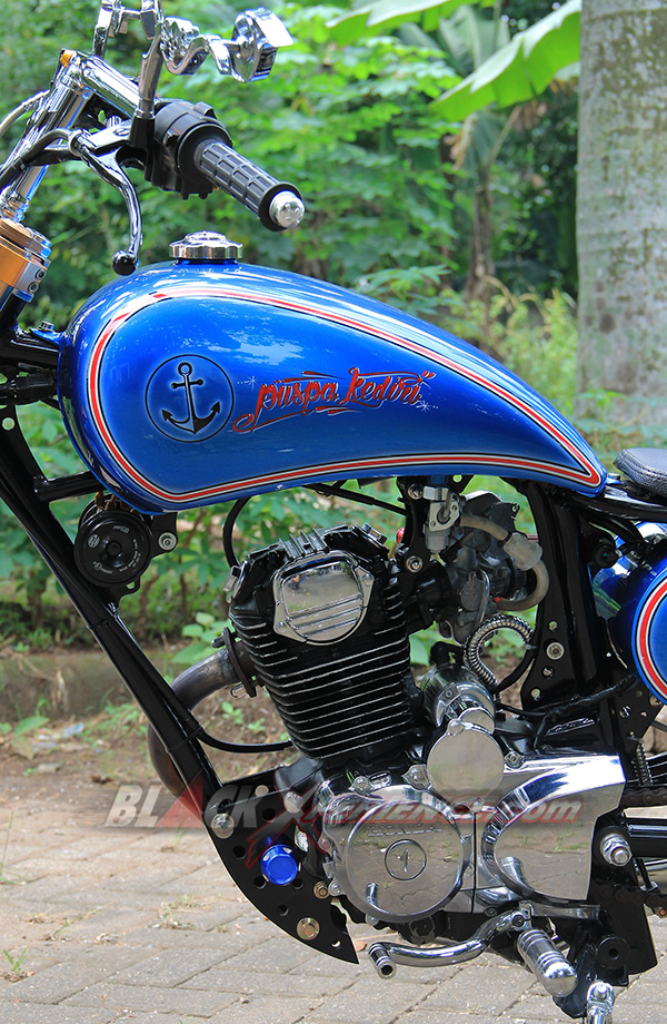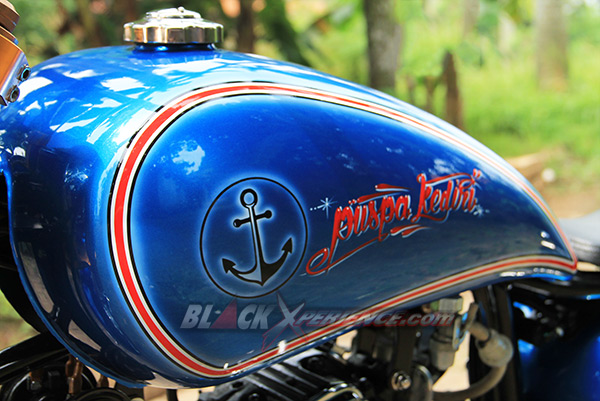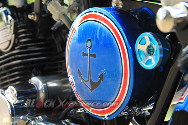 Puas dengan tampilan chopper-nya, giliran detailing warna bodi dibidik untuk memperkuat konsep terselubungnya. "Saya ingin menyisipkan tema tentang pelaut di motor ini, makanya saya konsultasikan dengan builder di sini (PKC_Red)", ujar Nur Cholis. Sang builder PKC, Aris dan Aya menyarankan untuk mengeksplor tema tersebut pada bagian pewarnaan bodi beberapa pernak-pernik yang bisa dibuat pada sisi setangnya. Bodi seluruhnya dibalut dengan warna biru laut. Kemudian di bagian tangki terselip airbrush berlogo jangkar dan di sisi samping tabung tempat kabel dan pusat kelistrikannya. Logo Jangkar tersebut tak hanya nempel di bodi saja, tetapi juga pada setang custom-nya.